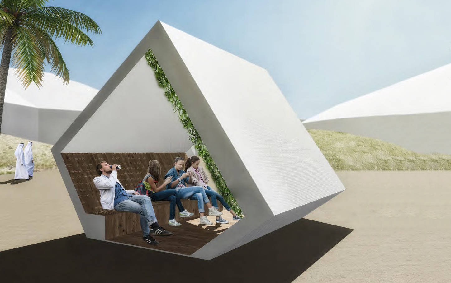 Immaginandosi il visitatore come un viaggiatore in cerca di relax, CuboEden si propone come uno spazio in cui ci si può sdraiare sotto una parete verde, ricaricare il proprio dispositivo mobile e nel frattempo conoscere altre persone, provenienti da ogni parte del mondo. L’obiettivo della proposta è fornire un innovativo luogo di sosta e socializzazione, da cui poi potersi rialzare rivitalizzati.
