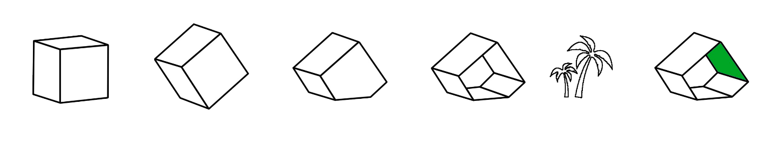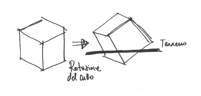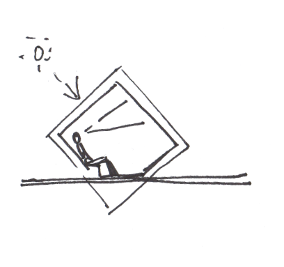 La proposta parte da una forma semplice: un cubo, ruotato di 35° in modo da creare, da un lato, una seduta, dall’altro, una parete inclinata che sembra quasi cadere sul visitatore, creando una sensazione mai vista in precedenza.